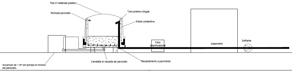 - digestore realizzato tramite una platea e una trincea di contenimento della biomassa, con riscaldamento a pavimento, dotato di guardia idraulica e delle strutture necessarie all’alloggiamento delle reti tecnologiche per la produzione del biogas;